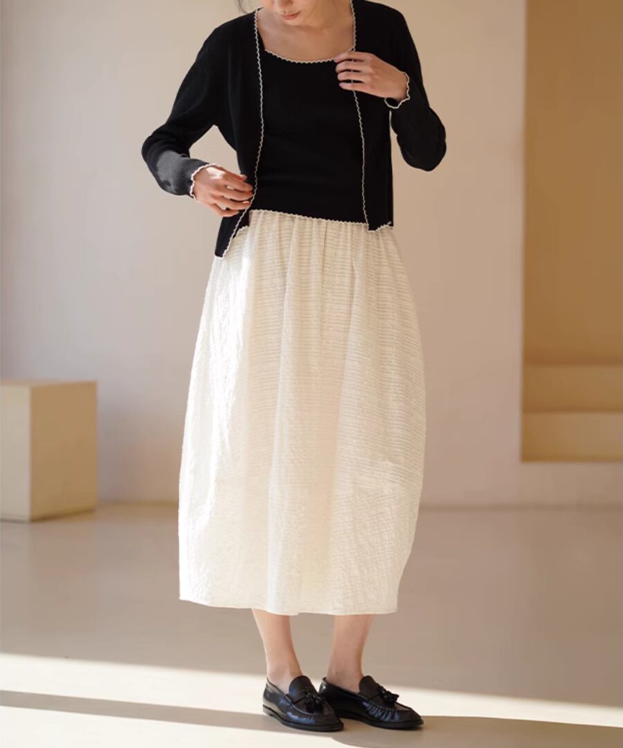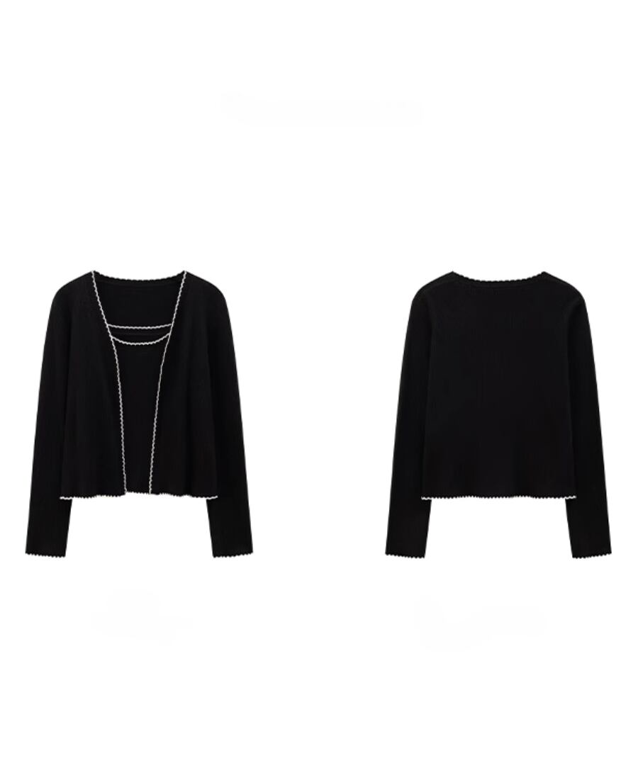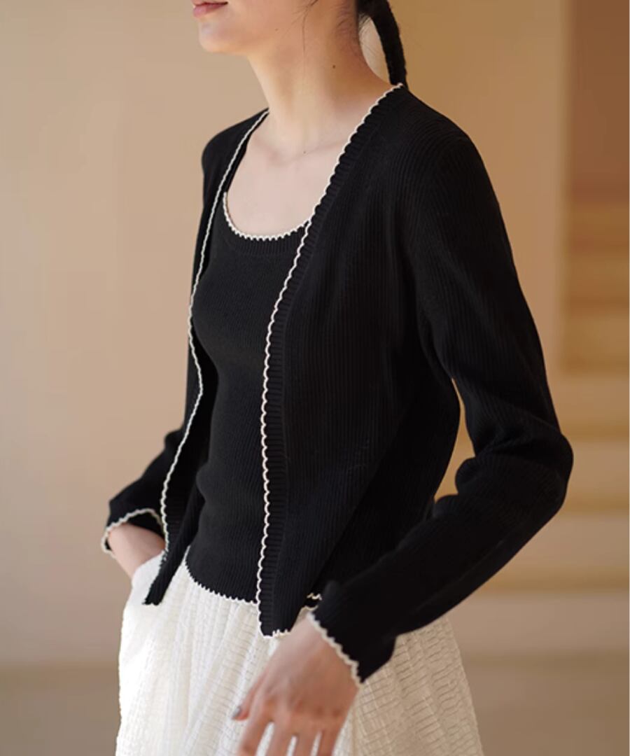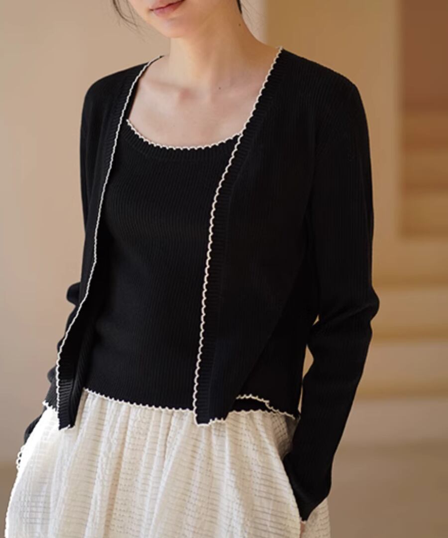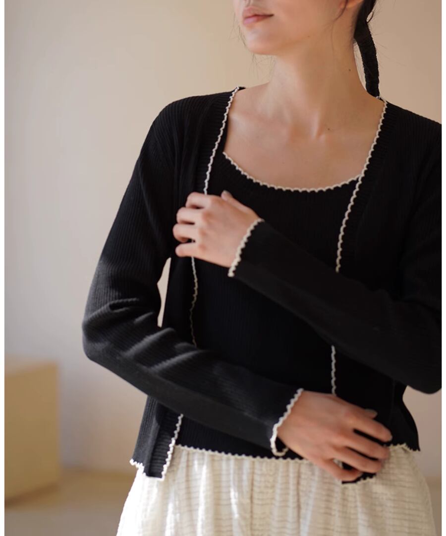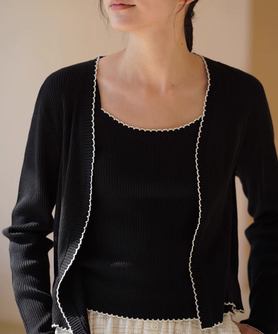 季節を問わず活躍するカーディガンとキャミソールのセット。