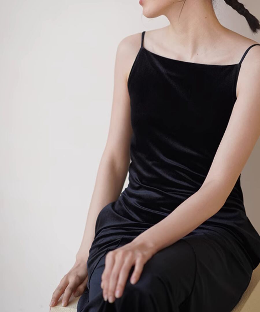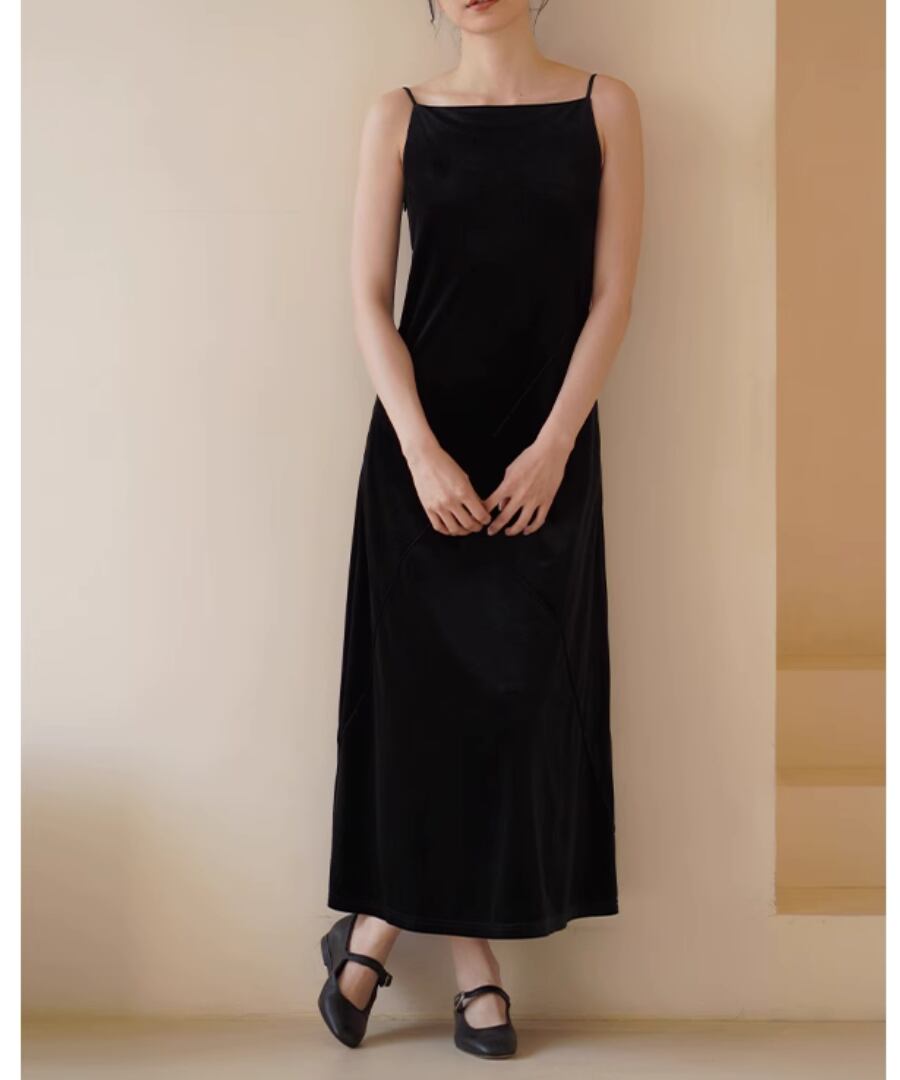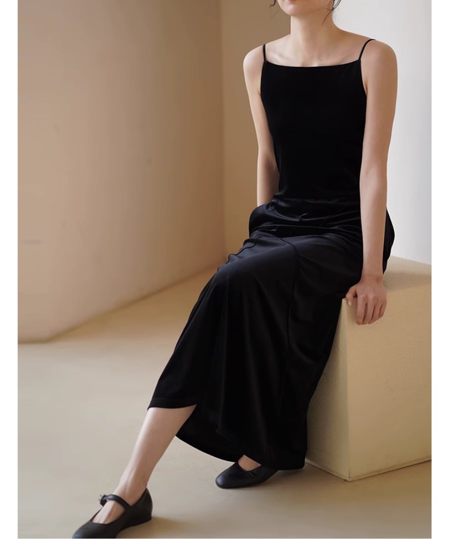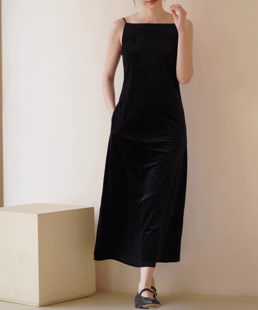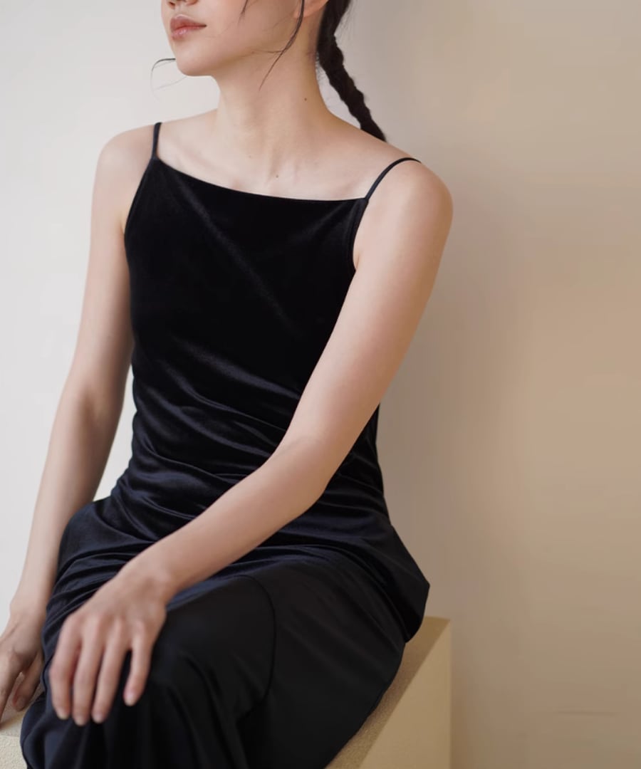 シンプルでありながら、特別な魅力を放つベルベット素材のキャミワンピ。