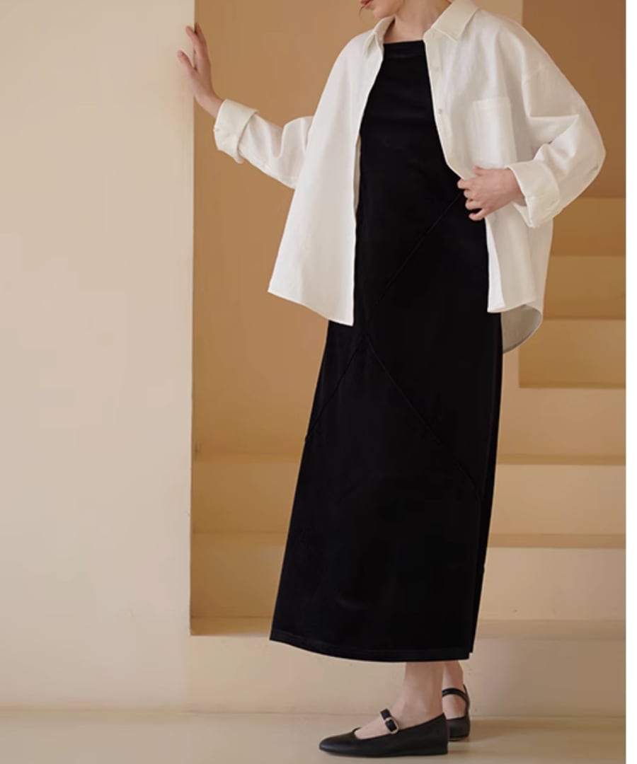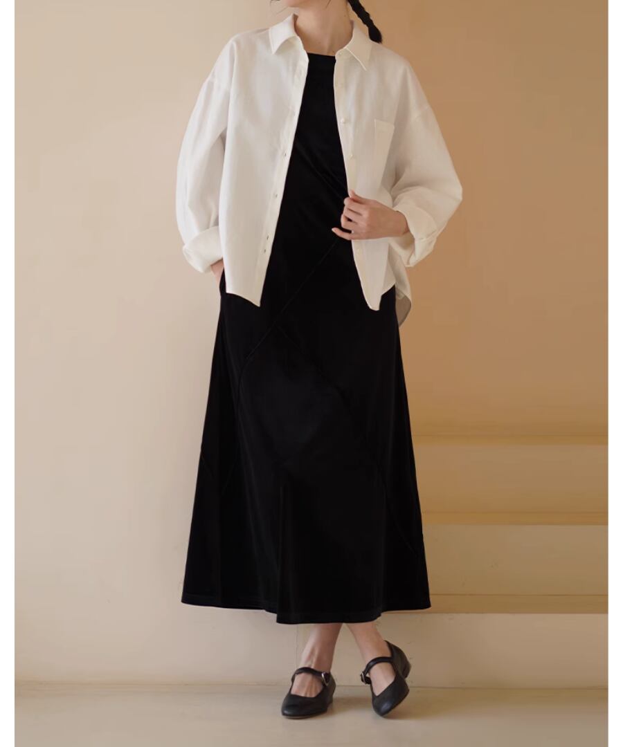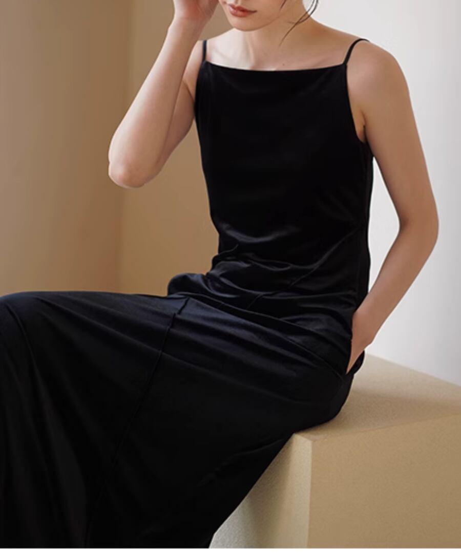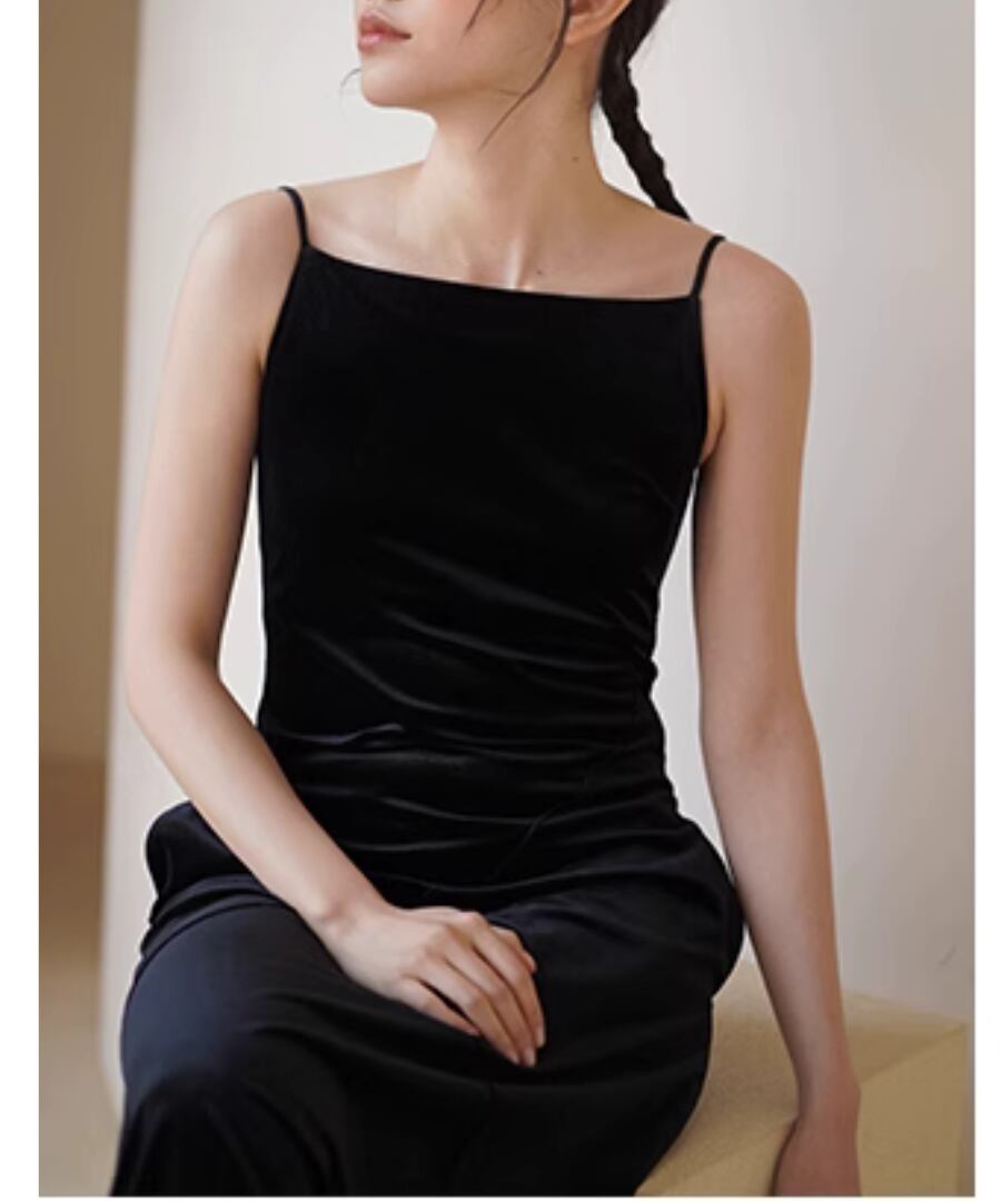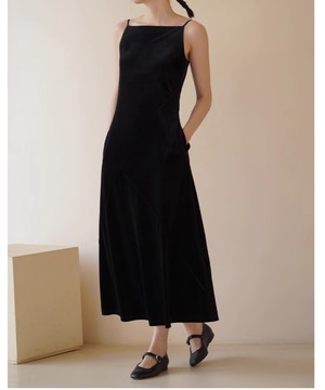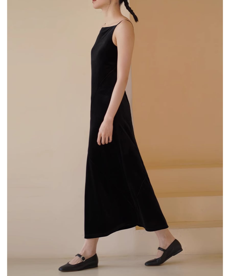 シンプルでありながら、特別な魅力を放つベルベット素材のキャミワンピ。